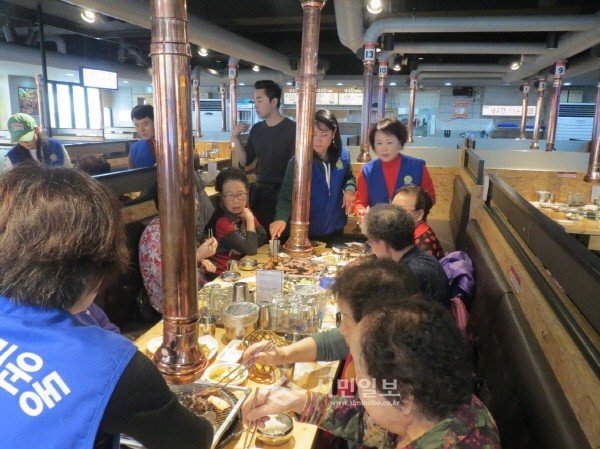 최근 경기 안산시 본오2동 바르게살기위원회는 지역내 식당에서 노인 100여명을 초청해 ‘사랑해·孝 경로잔치’를 개최했다. 사진은 위원들이 노인들에게 식사 대접을 하고 있는 모습.(사진제공=안산시청)
