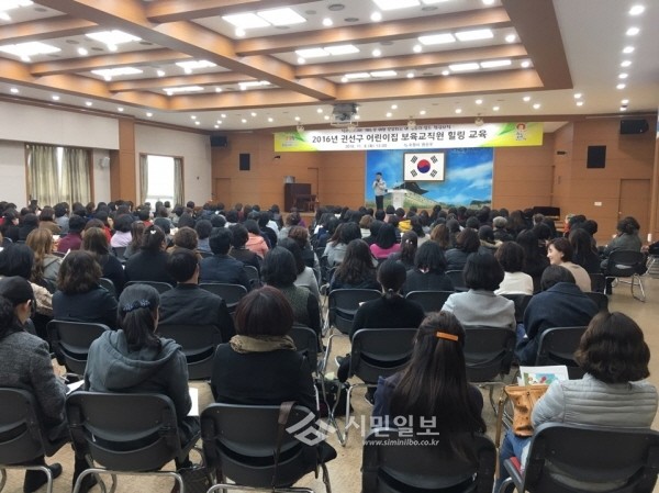 지난 8일 경기 수원시 권선구는 어린이집 원장, 보육교사 등 300여명이 참석한 가운데 어린이집 보육교직원 힐링 교육을 실시했다. 사진은 교육이 진행 중인 모습.(사진제공=권선구청)