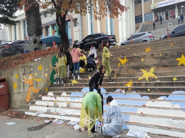 최근 경기 이천시 창전동 주민자치위원회는 C&C미술학원 강사, 학생 40여명과 함께 학교 통학로와 주민의 통행이 잦은 서희청소년문화센터 주변 계단을 '테마가 있는 계단'으로 꾸몄다. 사진은 참가 학생들이 계단을 단장하는 모습.(사진제공=이천시청)