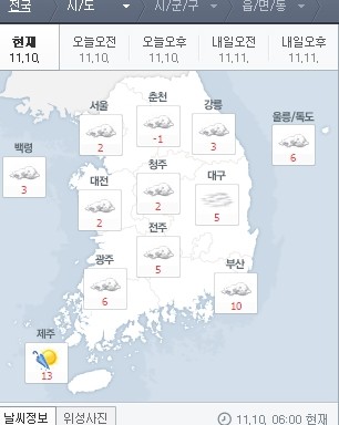 오늘 아침 예상 기온은 ▲서울 2도 ▲대전 2도 ▲부산 19도 ▲광주 6도 ▲울산 6도 ▲제주 13도 등이다.