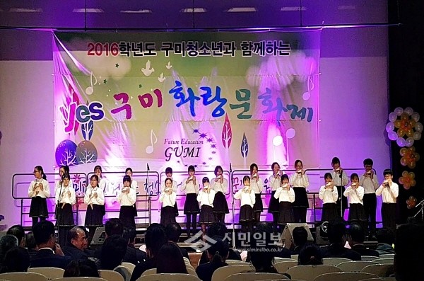 경북 구미시 소재 오태초등학교는 지난 8~9일 구미시민방위교육장에서 열린 '2016학년도 YES구미화랑문화제' 초등부 공연·전시에 참가했다. 사진은 음악예술동아리 학생들이 오카리나 합주를 하는 모습.(사진제공=오태초등학교)