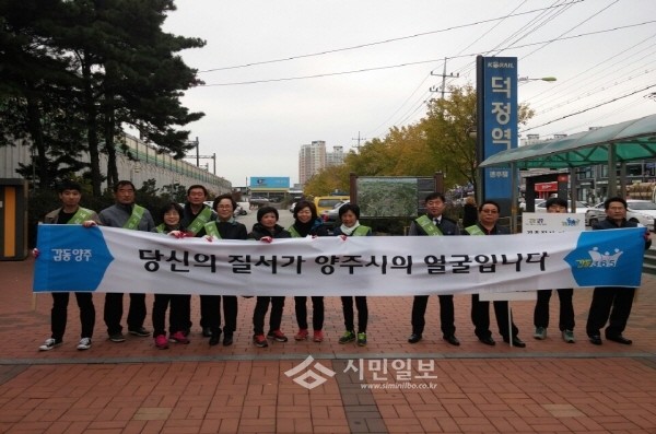지난 7일 경기 양주시 회천1동 감동365추진협의체는 덕정역에서 감동365 범시민 실천운동의 일환으로 기초질서 지키기 캠페인을 펼쳤다. 사진은 참여자들이 기념촬영하는 모습.(사진제공=양주시청)