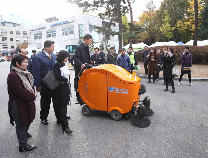 10일 서울 영등포구가 도입한 선진 로봇 노면청소기 견학을 위해 싱가폴 환경청 공무원단이 구청을 방문했다. 사진은 싱가폴 환경청 관계자가 로봇 노면청소기를 시연하고 있는 모습.(사진제공=영등포구청)