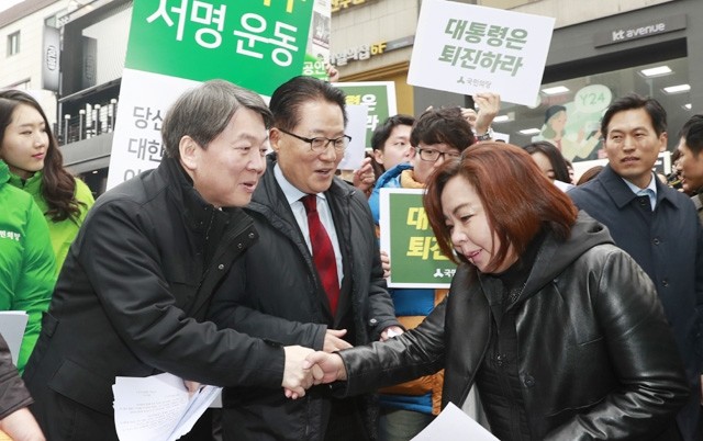 국민의당 박지원 비상대책위원장(가운데)과 안철수 전 대표가 10일 오전 서울 홍대입구역 앞에서 박근혜 대통령 퇴진 오프라인 서명 운동을 하며 시민과 악수하고 있다.