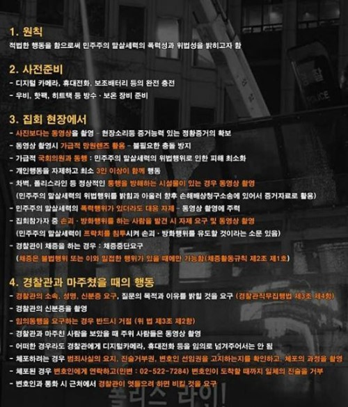 해당 그림에는 원칙, 사전 준비, 집회 현장, 경찰과 마주쳤을 때의 행동 등 총 네 가지 항목으로 광화문 촛불 집회에 필요한 부분들이 상세히 묘사돼있다.
