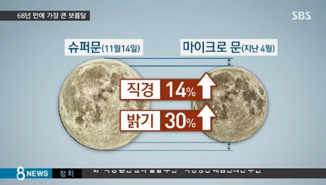 오늘 밤 달은 지구와의 거리 35만 6천509km로 가장 근접하게 통과하면서 1948년 이후 68년 만에 가장 큰 형태를 나타내겠다. 이는 지난 4월 22일 뜬 가장 작은 보름달보다 약 14% 클 전망이다.