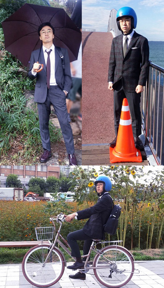 지난 13일 방송된 KBS2 드라마스페셜 '웃음실격'에서 못 웃기는 남자 기상예보관 이지로 역을 연기하며 꺼벙미를 뽐낸 배우 조달환은 촬영 비하인드컷을 공개하며 귀여운 매력을 가득 발산했다. 깔끔한 정장과 정갈한 헤어 스타일에 헬멧을 매치한 그는 엉뚱한 매력으로 드라마 속 캐릭터를 드러낸다.