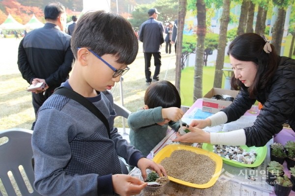 경북 구미시가 주최하고, 구미시사회복지협의회가 주관하는 '2016 행복나눔박람회'가 지난 12일 금오산 잔디분수광장에서 성황리에 개최됐다. 사진은 박람회에서 어린이들이 테라리움 작품을 만드는 모습.(사진제공=구미시청)