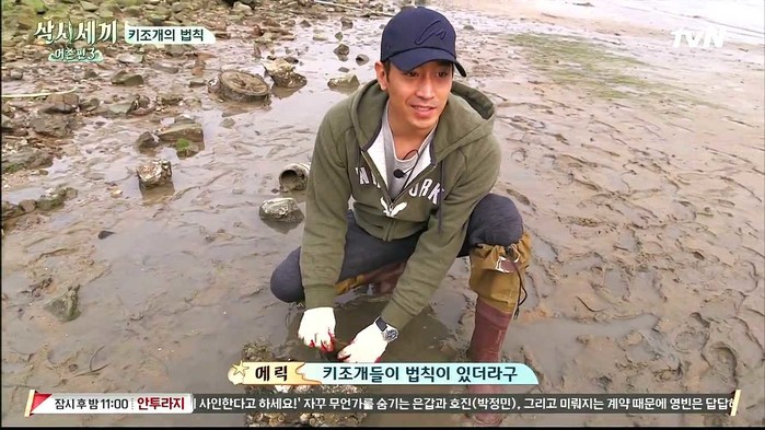 에릭은 고둥 수확을 시작으로, 바위 옆에 붙어 살거나 혹은 갯벌 위에 동떨어져 있는 키조개를 윤균상과 함께 찾아내기 시작했다.