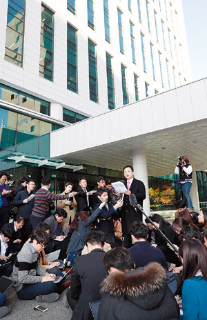박근혜 대통령의 변호인으로 선임된 유영하 변호사가 15일 오후 서울 서초동 고등검찰청 앞에서 기자회견을 열고 취재진 질문에 답하고 있다.
