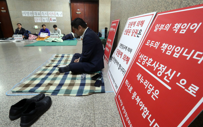 새누리당 이용원 중앙청년위원장이 16일 오전 국회 새누리당 대표실 앞에서 "당원에 의해 선출된 당권은 당헌당규에 따라 당원에 의해 판단받아야 한다"며 이정현 대표의 사퇴 반대 농성을 벌이고 있다. 뒤로 이정현 대표의 사퇴를 촉구하며 단식 4일차를 맞은 새누리당 원외당협위원장들의 모습이 보인다.