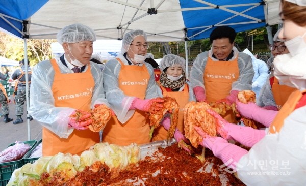 지난 15일 서울 동대문구는 배봉산근린공원 광장에서 자원봉사자 220여명이 참여한 가운데 ‘사랑의 김장 나눔 릴레이’ 행사를 개최했다. 사진은 유덕열 구청장(왼쪽에서 두번째)이 봉사자들과 함께 김치를 담그며 웃고 있는 모습.(사진제공=동대문구청)