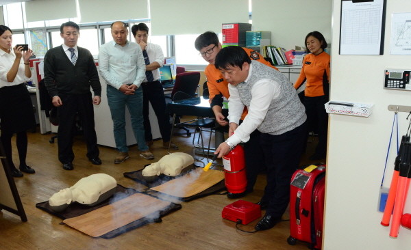 지난 15일 서울 영등포소방서는 영등포 롯데시네마 직원을 대상으로 안전사고 및 화재예방을 위한 '소방안전체험 교실'을 운영했다. 사진은 소방서 관계자가 소화기 사용법에 대해 교육하는 모습.(사진제공=영등포소방서)