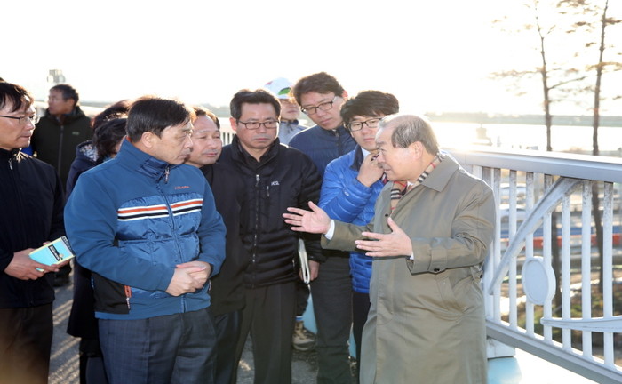 지난 15일 박홍섭 마포구청장은 상암동과 영등포구 양평동을 잇는 다리인 월드컵대교의 공사현장을 방문해 공정현황 등을 확인했다. 사진은 박 구청장(맨 오른쪽)이 관계부서 직원들과 이야기를 나누는 모습.(사진제공=마포구청)