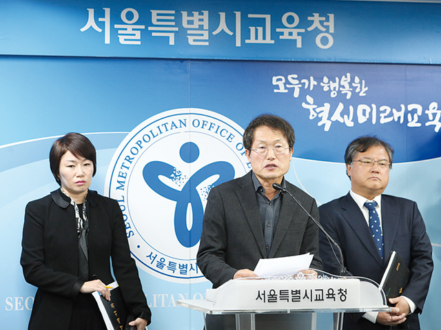 조희연 서울시교육감이 16일 오후 서울 종로구 서울교육청에서 현 정부 ‘비선실세’ 최순실 씨의 딸 정유라 씨의 교교시절 특혜 의혹과 관련, 청담고 등에 대한 특정감사 중간 결과를 발표하고 있다. 이번 감사로 정 씨가 고교 시절 출결과 성적 관리 등에서 비정상적이고 광범위한 특혜를 받았다는 의혹이 사실로 확인됐다.