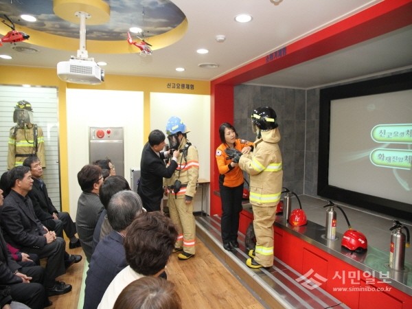 지난 15일 서울 구로소방서는 3층 강당 및 시민안전체험교실에서 서울시 남부교육지원청 초등학교 학교장 60여명을 대상으로 '안전체험교육'을 운영했다. 사진은 참여자들이 방화복을 입어보는 모습.(사진제공=구로소방서)