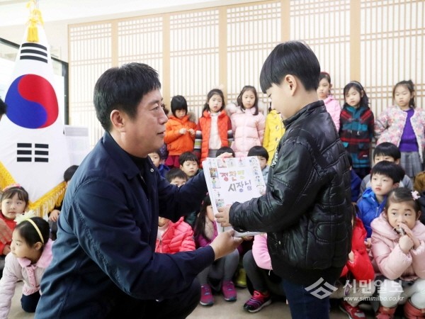 지난 16일 경기 용인시 기흥구 청덕동 물푸레마을7단지 루아숲유치원에 다니는 유치원생들이 시청을 찾아 용돈과 시장놀이 수익금을 모은 '이웃돕기 성금' 50만원을 기탁했다. 사진은 정찬민 시장이 어린이에게 성금을 전달받는 모습.(사진제공=용인시청)