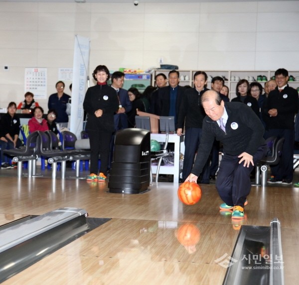 지난 16일 서울 마포구는 구민체육센터 볼링장에서 구에 등록된 지적·자폐성 장애인 80명의 선수가 참여한 가운데 '제3회 마포구청장배 장애인 볼링대회'를 개최했다. 사진은 박홍섭 구청장이 볼링을 치고 있는 모습.(사진제공=마포구청)