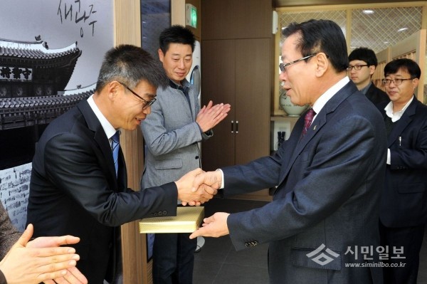 최근 경기 광주시는 시장집무실에서 올해 대학수학능력 시험을 치루는 자녀를 둔 공직자 67명에게 ‘수능 대박 기원 찹쌀떡’을 전달했다. 사진은 조억동 시장(오른쪽)이 떡을 전달하고 악수하는 모습.(사진제공=광주시청)
