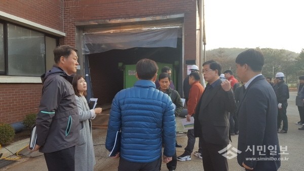 지난 17일 경기 포천시는 영중가축분뇨공공처리시설에서 악취저감 우수공법인 '바이오옥시전 시스템'의 악취개선 효과를 살펴보는 시연회를 열었다. 사진은 민천식 시장 권한대행(오른쪽에서 두번째)과 관계자들이 이야기를 나누는 모습.(사진제공=포천시청)