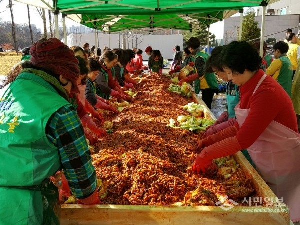 최근 경기 하남시 덕풍3동 새마을지도자협의회와 부녀회는 동 행정복지센터 뒤 공터에서 지역내 어려운 이웃에게 전달하기 위한 ‘사랑의 김장김치 만들기’ 행사를 개최했다. 사진은 봉사자들이 김장을 담그는 모습.(사진제공=하남시청)