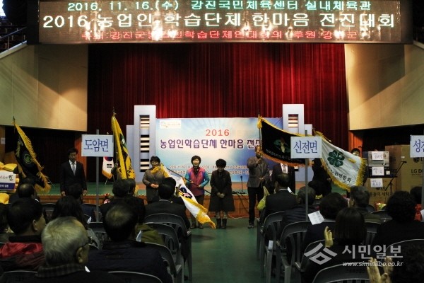 최근 전남 강진군 국민체육센터 실내체육관에서 고품질 농산물 생산과 소득 창출을 위한 '2016 농업인학습단체 한마음전진대회'가 개최됐다. 사진은 참가자들이 대회를 진행하고 있는 모습.(사진제공=강진군청)