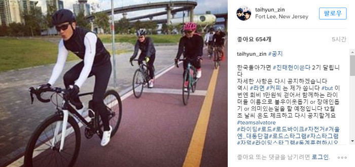 진태현은 최근 자신의 인스타그램에 자전거를 타고 있는 사진과 함께 "한국돌아가면 #진태현이쏜다 2기 달립니다"라며 이벤트를 깜짝 공개했다.