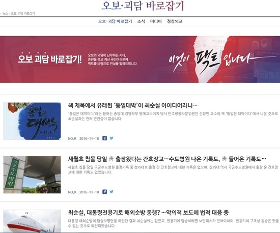 청와대는 18일 홈페이지에 '오보 괴담 바로잡기, 이것이 팩트입니다' 배너를 내걸고 박 대통령에 대한 각종 의혹들에 대해 반박하는 내용의 게시물들을 게재했다.