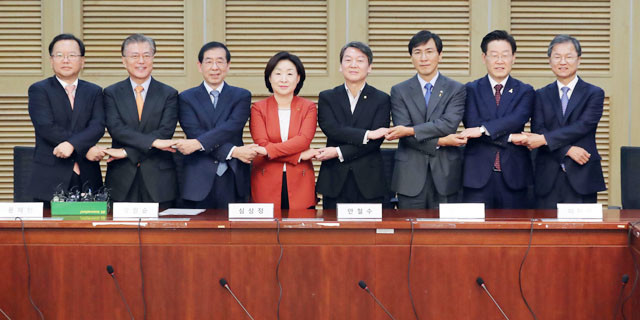 20일 오전 국회 의원회관에서 열린 ‘비상시국 정치회의’에서 야권 대선주자들이 함께 포즈를 취하고 있다. 왼쪽부터 김부겸, 문재인, 박원순, 심상정, 안철수, 안희정, 이재명, 천정배.