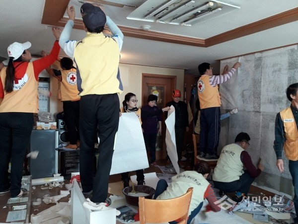 지난 19일 경기 양주시청의 그루터기 봉사회, 회천4동 적십자봉사회, 감동365 추진협의체 시민감동분과는 조손가정을 위해 도배 봉사를 실시했다. 사진은 참여자들이 도배하는 모습.(사진제공=양주시청)