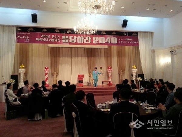 지난 19일 경기 용인시는 여성단체협의회 주관으로 시청 컨벤션홀에서 미혼남녀의 결혼과 출산을 장려하는 ‘매력남녀 커플매칭’ 행사를 개최했다. 사진은 사회자가 매칭 행사를 진행하고 있는 모습.(사진제공=용인시청)