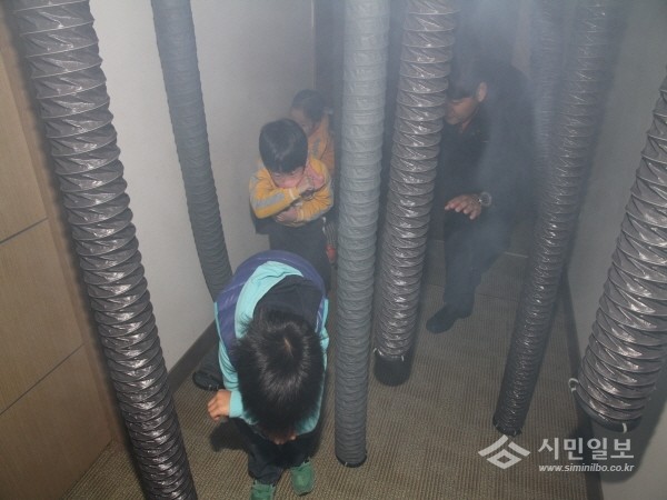 21일 서울 은평소방서는 시민안전체험관을 방문한 지역내 신사홍익 어린이집 원생과 지도교사 40여명에 대해 화재예방 소방안전교육을 실시했다. 사진은 어린이들이 열·연기 피난체험을 하는 모습.(사진제공=은평소방서)