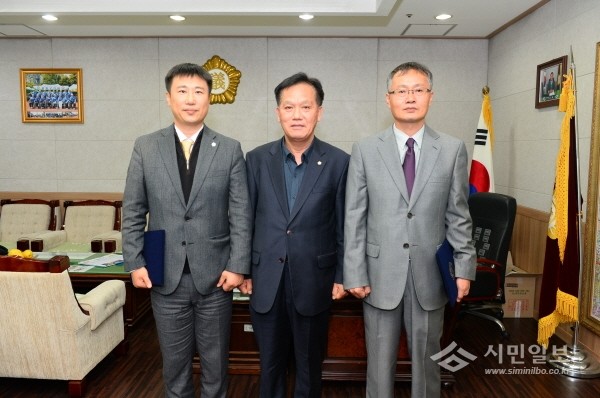 | ▲ 강대호 의장(가운데)이 고삼식 변호사(오른쪽), 천정환 변호사(왼쪽)와 기념촬영을 하고 있다. | ||