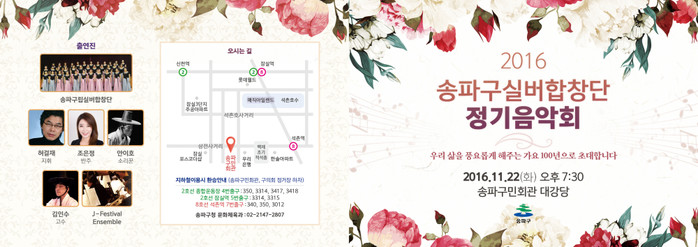 [시민일보=이대우 기자]서울 송파구(구청장 박춘희)가 송파구민회관 대강당에서 22일 오후 7시30분 ‘송파구립실버합창단 정기음악회’를 개최한다.