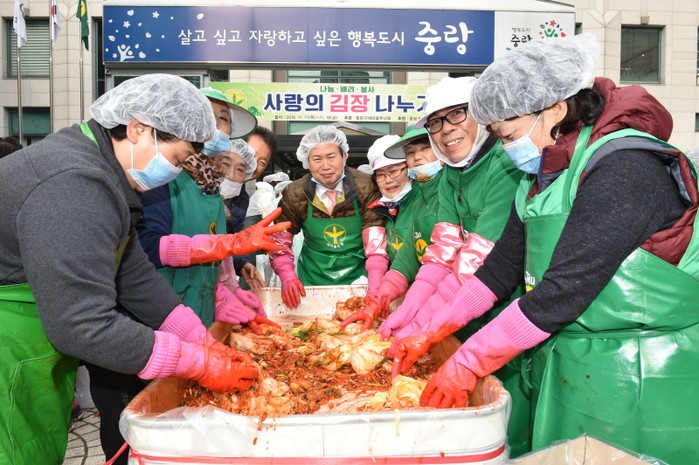 중랑구는 최근 구청 중앙광장에서 ‘사랑의 김장 담가주기’ 행사를 개최했다. 사진은 나진구 구청장(가운데)이 구새마을부녀회 관계자들과 함께 김장을 하는 모습.(사진제공=중랑구청)