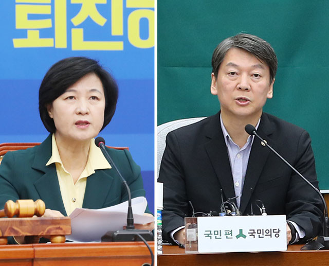 더불어민주당 추미애 대표가 21일 오전 국회에서 열린 최고위원회의에서 발언하고 있다(왼쪽). 국민의당 안철수 전 상임공동대표가 21일 오전 국회에서 열린 비상대책위 회의에서 발언하고 있다.