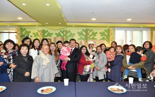 지난 21일 서울 중랑구는 용마산경로당(용마산로 327) 2층에 개설된 ‘공동육아나눔터’의 개소식 행사를 개최했다. 사진은 나진구 구청장(가운데)이 아이를 안고 지역주민들과 기념촬영하고 있는 모습.(사진제공=중랑구청)