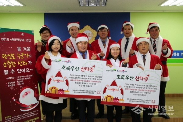 지난 21일 경기 김포시의회 의원들이 초록우산어린이재단 경기북부지역본부 및 김포아이사랑센터에서 진행하는 산타원정대에 참여했다. 사진은 유영근 의장(앞줄 왼쪽에서 두번째)과 의원들이 산타복을 입고 기념촬영하는 모습.(사진제공=김포시의회)