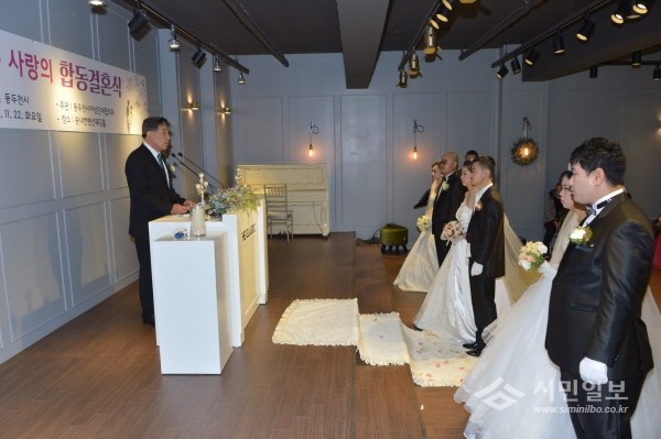지난 22일 경기 동두천시여성단체협의회가 송내컨벤션웨딩홀에서 개최한 ‘사랑의 합동결혼식’에서 다문화가정 등 3쌍의 부부가 함께 나란히 서서 오세창 동두천시장의 축사를 듣고 있다.(사진제공=동두천시청)