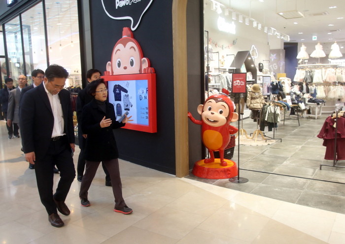 지난 22일 광역상권 벤치마킹을 위해 신연희 강남구청장(오른쪽)이 경기 하남시에 위치한 하남 스타필드 복합쇼핑몰을 방문, 관계자와 매장을 둘러보며 벤치마킹에 대한 이야기를 나누고 있다.(사진제공=강남구청)