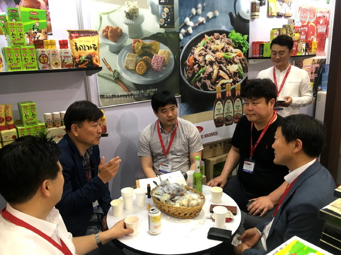 | ▲ 지난 5월 태국 방콕에서 개최된 ‘2016 THAIFEX 태국국제식품박람회’에서 포천지역 업체들이 상품을 진열한 부스내에서 이야기를 나누는 모습. | ||