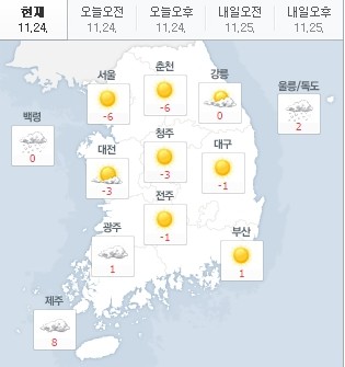 현재 서울은 영하 6도, 춘천 영하 6도, 대전 영하 3도, 부산 1도, 제주 8도를 기록 중이다. 현재 한파주의보가 발효됐다.