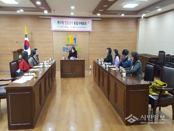 지난 23일 경기 수원시 영통구는 구청 상황실에서 복합적이고 다양한 욕구를 가진 대상자에게 맞춤형 복지서비스를 제공하기 위한 민관 합동 사례회의를 개최했다. 사진은 참여자들이 회의하는 모습.(사진제공=영통구청)