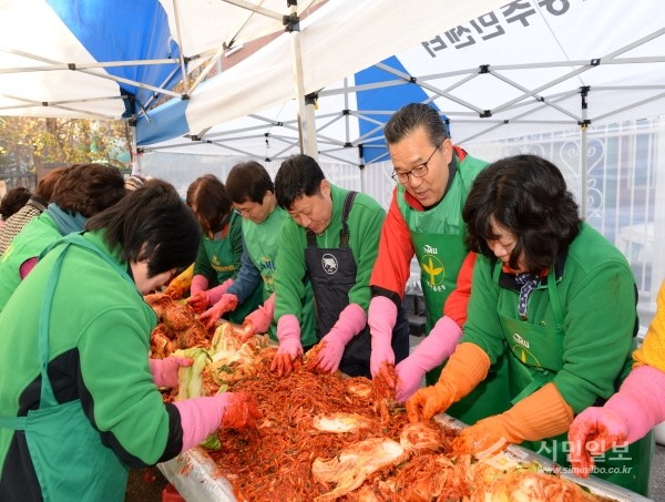 최근 인천 연수구 연수2동 새마을부녀회는 주민센터에서 지역내 어려운 이웃을 위한 ‘사랑의 김장나누기 행사’를 실시했다. 사진은 이재호 구청장(오른쪽에서 두 번째)과 관계자들이 김치를 담그는 모습.(사진제공=연수구청)