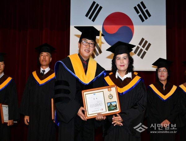 지난 23일 경기 양평군은 농업기술센터 친환경농업교육관에서 '제17기 양평군친환경농업대학 졸업식'을 개최했다. 사진은 김선교 군수(왼쪽)가 학업우수상을 받은 졸업생과 함께 기념촬영하는 모습.(사진제공=양평군청)