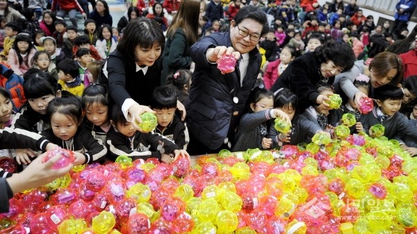 지난 24일 서울 광진구는 구청 대강당에서 어린이집 원아들이 모은 ‘작은 손 따뜻한 사랑의 저금통 나누기’를 개최했다. 사진은 김기동 구청장(가운데)이 어린이들과 저금통을 개봉하고 있는 모습.(사진제공=광진구청)