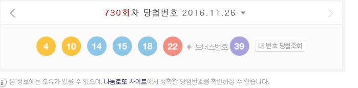 730회 로또 당첨번호는 '10, 4, 14, 15, 22, 18' 보너스 번호는 '39'