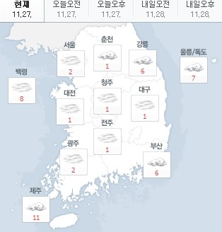 오늘 오전 서울은 2도, 대전은 1도, 광주 2도, 춘천 1도, 강릉 6도, 부산 6도, 제주 11도다.