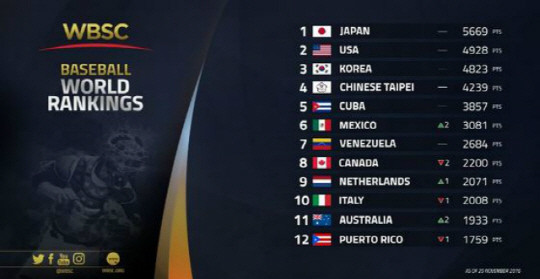 세계야구소프트볼연맹(WSBC)이 26일(한국시간) 발표한 세계랭킹에서 한국은 4823점으로 3위에 랭크됐다.