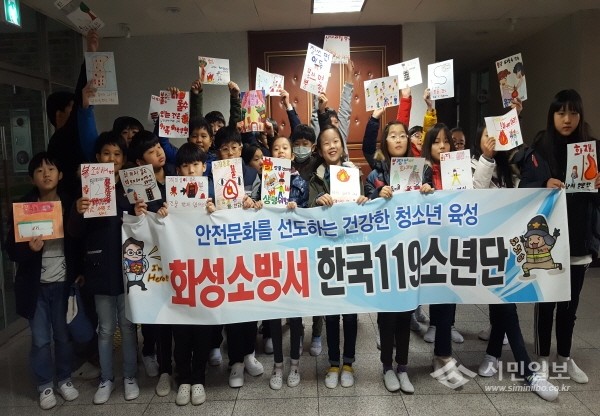 지난 25일 경기 화성소방서는 수영초등학교에서 소방공무원, 119소년단 지도교사와 소년단원 학생들과 함께 교내 학생들을 대상으로 겨울철 화재예방 캠페인을 실시했다. 사진은 참여학생들이 기념촬영하는 모습.(사진제공=화성소방서)